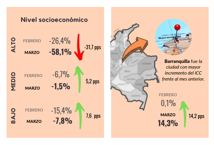 En marzo, el Índice de Confianza del Consumidor (ICC) registró un balance de -17,8%, representando una disminución de 0,3 puntos porcentuales (pps) frente al mes anterior. Este resultado obedeció principalmente a un aumento de 4,5 pps en el Índice de Condiciones Económicas y a una caída de 3,5 pps en el Índice de Expectativas del Consumidor. Así como la confianza del consumidor disminuyó frente al mes de febrero, también lo hizo con respecto a marzo 2021, lo cual demuestra que la economía se encuentra atravesando una gran incertidumbre. La confianza de los consumidores disminuyó en el nivel socioeconómico medio frente al mes pasado, mientras que aumentó en lo referente a los niveles socioeconómicos alto y bajo. Con respecto a las ciudades analizadas, aumentó en Barranquilla y Medellín frente a febrero de 2022. A su vez, la disposición a comprar vivienda disminuyó frente al mes pasado, pero la disposición a comprar bienes muebles y electrodomésticos aumentó.