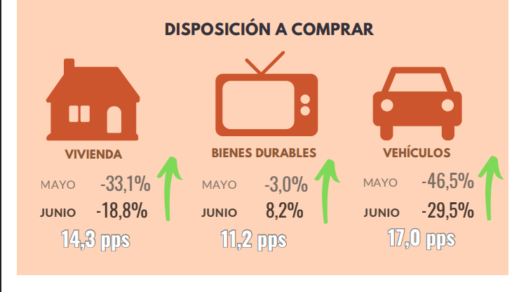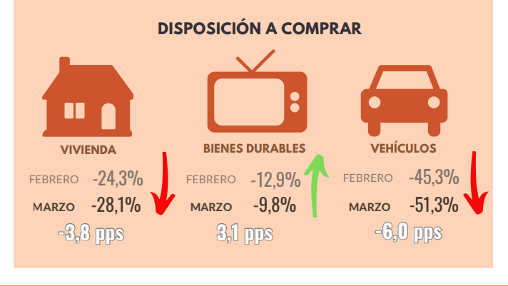 - Relativo al mes anterior, la disposición a comprar bienes durables aumentó, contrario a la disminución en la disposición a comprar vivienda.