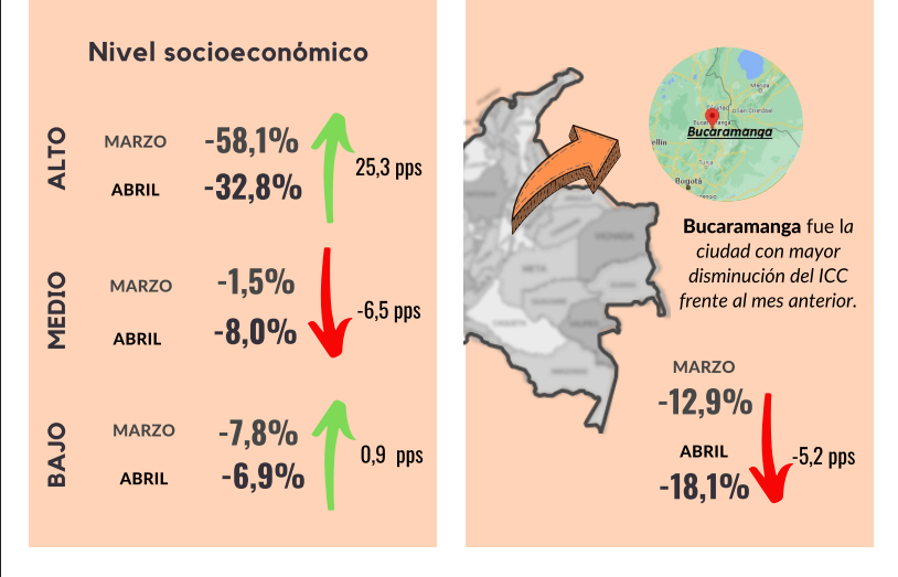 En abril de 2023, el Índice de Confianza del Consumidor (ICC) disminuyó en 0,3 puntos porcentuales (pps) frente a marzo de 2023, alcanzando un balance de -28,8%. Esta disminución se debe principalmente a una disminución de 2,2 pps en el Índice de Expectativas del Consumidor, compensado parcialmente por una mejoría de 2,4 pps en el Índice de Condiciones Económicas. Por ciudades, la confianza del consumidor disminuyó en Cali, Barranquilla y Bucaramanga, e incrementó en Bogotá y Medellín. En cuanto a los estratos, se observó una reducción de la confianza en el nivel socioeconómico alto y bajo, mientras que aumentó en el estrato medio. Por su parte, la disposición a comprar vivienda disminuyó, mientras que la disposición a comprar vehículo y bienes muebles y electrodomésticos incrementó con respecto al mes de marzo.