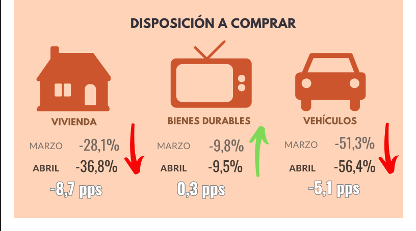 En el mes de abril, la confianza del consumidor incrementó en dos de las cinco ciudades analizadas, y en el nivel socioeconómico medio. La disposición a comprar vivienda y vehículo incrementó, mientras que la disposición a comprar bienes durables disminuyó con respecto al mes anterior.