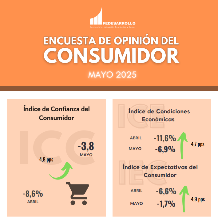 En mayo de 2025, el Índice de Confianza del Consumidor (ICC) alcanzó un balance de -3,8%, aumentando en 4,8 puntos porcentuales frente al mes de abril de 2025 (-8,6%). Este resultado obedeció a un aumento de 4,9 puntos porcentuales en el Índice de Expectativas del Consumidor, y a un incremento de 4,7 puntos porcentuales en el Índice de Condiciones Económicas. Frente a mayo de 2024 (-14,1%), el ICC aumentó en 10,3 puntos porcentuales.