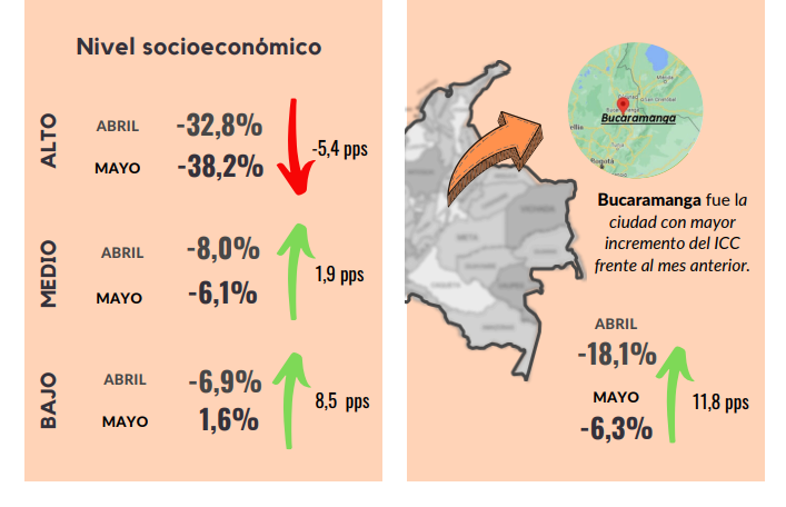 En mayo de 2023, el Índice de Confianza del Consumidor (ICC) incrementó en 6,0 puntos porcentuales (pps) frente al mes de abril de 2023, alcanzando un balance de -22,8%. Esta mejoría se debe principalmente a un incremento de 3,8 pps en el Índice de Expectativas del Consumidor y un incremento de 9,5 pps en el Índice de Condiciones Económicas. Por ciudades, la confianza del consumidor incrementó en Bogotá, Cali, Barranquilla y Bucaramanga, mientras disminuyó en Medellín. En cuanto a los estratos, se observó un aumento de la confianza en el nivel socioeconómico medio y bajo, mientras que disminuyó en el estrato alto. Por su parte, la disposición a comprar vivienda, vehículo y bienes muebles y electrodomésticos incrementó con respecto al mes de abril.