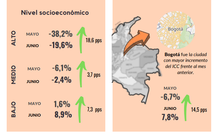 En junio, el Índice de Confianza del Consumidor (ICC) registró un balance de 2,9%, representando un aumento de 17,6 puntos porcentuales (pps), lo cual demuestra una acelerada recuperación en la confianza que se había perdido a inicios de año. Este resultado obedeció principalmente a un incremento de 21 pps en el Índice de Expectativas del Consumidor y de 12,5 pps en el Índice de Condiciones Económicas. La confianza de los consumidores aumentó en los niveles socioeconómicos medio y bajo, mientras que para el nivel alto cual cayó 0,8 pps. Con respecto a las ciudades analizadas, la confianza aumentó en todas las ciudades analizadas, a diferencia del mes pasado. La disposición a comprar vivienda aumentó frente al mes de mayo al igual que la disposición a comprar bienes muebles y electrodomésticos.