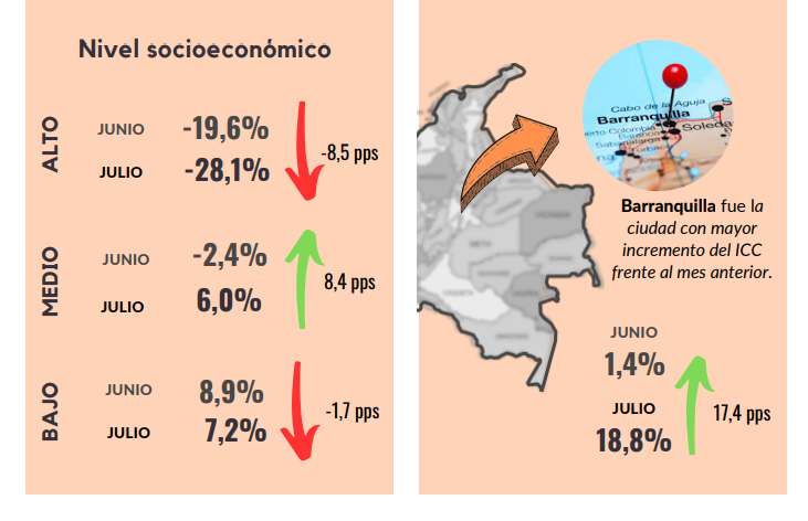 En julio, el Índice de Confianza del Consumidor (ICC) registró un balance de -10,4%, lo que representa una caída de 13,3 puntos porcentuales (pps). Esto demuestra una menor confianza de los consumidores, luego de obtener un balance positivo el mes anterior. Este resultado obedeció principalmente a una reducción de 13,2 pps en el Índice de Expectativas del Consumidor y de 13,3 pps en el Índice de Condiciones Económicas. La confianza de los consumidores cayó en todos los niveles socioeconómicos. Con respecto a las ciudades analizadas, la confianza se redujo en todas las ciudades, excepto en Barranquilla. La disposición a comprar vivienda cayó frente al mes de junio, al igual que la disposición a comprar bienes muebles y electrodomésticos.