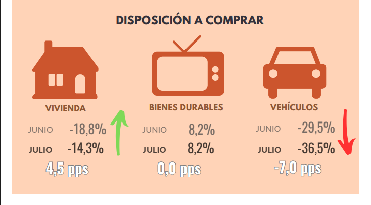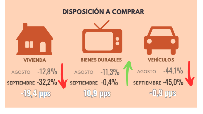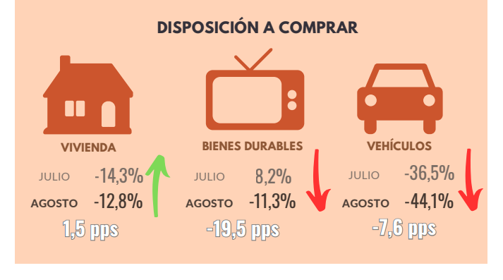 - Con respecto al mes anterior, la disposición a comprar bienes durables y vehículos disminuyó.