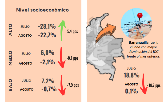 En agosto, el Índice de Confianza del Consumidor (ICC) registró un balance de -2,4%, lo que representa un aumento de 8,0 puntos porcentuales (pps) frente al mes anterior. Esto demuestra una recuperación de la confianza de los consumidores, a pesar de que el indicador se mantiene en niveles negativos. Este resultado obedeció principalmente a un aumento de 11,8 pps en el Índice de Expectativas del Consumidor y de 2,1 pps en el Índice de Condiciones Económicas. La confianza de los consumidores aumentó en todos los niveles socioeconómicos. Con respecto a las ciudades analizadas, la confianza aumentó en todas las ciudades, excepto en Bucaramanga. La disposición a comprar vivienda aumentó frente al mes de julio, mientras que la disposición a comprar bienes muebles y electrodomésticos cayó.