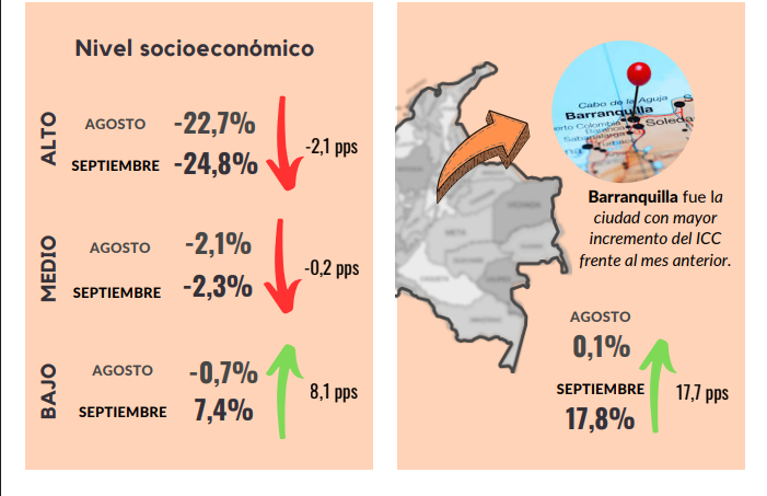 En septiembre, el Índice de Confianza del Consumidor (ICC) registró un balance de -11,5%, lo que representa una disminución de 9,1 puntos porcentuales (pps) frente al mes anterior. Esto demuestra una menor confianza de los consumidores comparado con el mes anterior, a pesar de que el índice lleva una tendencia positiva en lo corrido del año. Este resultado obedeció principalmente a una caída de 14,5 pps en el Índice de Expectativas del Consumidor y de 0,9 pps en el Índice de Condiciones Económicas. La confianza de los consumidores cayó en todos los niveles socioeconómicos. Con respecto a las ciudades analizadas, la confianza disminuyó en todas las ciudades, excepto en Barranquilla. La disposición a comprar vivienda disminuyó frente al mes de agosto, mientras que la disposición a comprar bienes muebles y electrodomésticos aumentó.