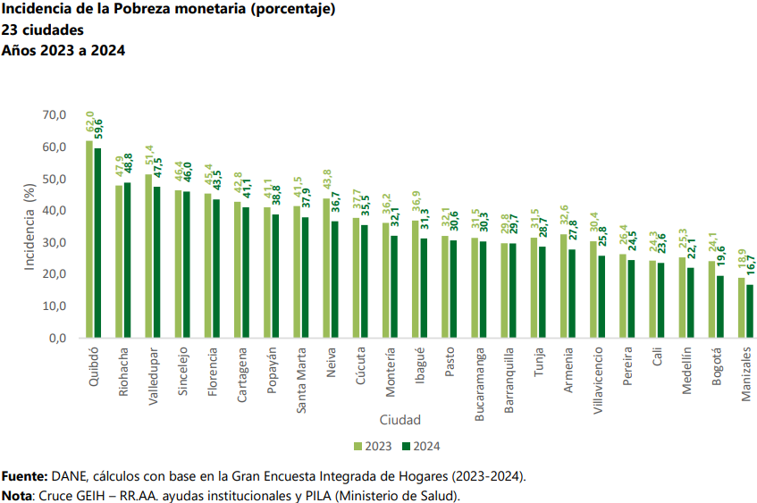 En 2024, las ciudades que experimentaron mayor pobreza monetaria fueron Quibdó con el 59,6%, seguida de Riohacha, con el 48,8%. Por su parte, Manizales y Bogotá con el 16,7% y el 19,6%, respectivamente, fueron las ciudades que presentaron menor incidencia.