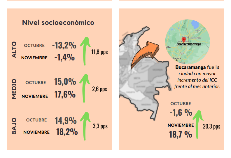 En noviembre de 2025, el Índice de Confianza del Consumidor (ICC) alcanzó un balance de 17,0%, aumentando en 3,4 puntos porcentuales frente al mes de octubre de 2025 (13,6%). Este resultado obedeció a un incremento de 5,0 puntos porcentuales en el Índice de Condiciones Económicas y a un aumento de 2,3 puntos porcentuales en el Índice de Expectativas del Consumidor. Frente a noviembre de 2024 (-5,7%), el ICC aumentó en 22,7 puntos porcentuales.
