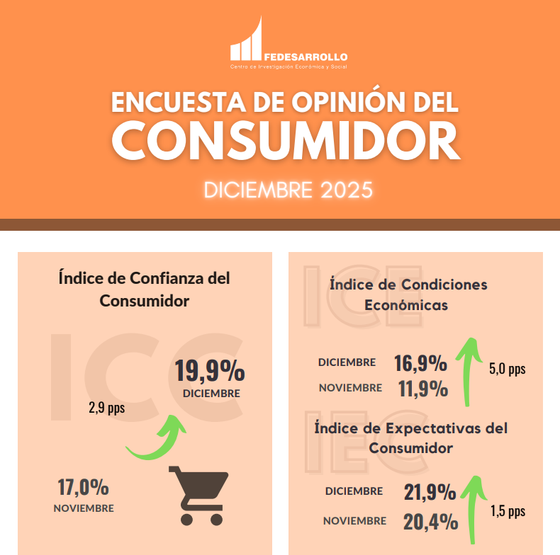 En diciembre de 2025, el Índice de Confianza del Consumidor (ICC) alcanzó un balance de 19,9%, aumentando en 2,9 puntos porcentuales frente al mes de noviembre de 2025 (17,0%). Este resultado obedeció a un incremento de 5,0 puntos porcentuales en el Índice de Condiciones Económicas y a un aumento de 1,5 puntos porcentuales en el Índice de Expectativas del Consumidor. Frente a diciembre de 2024 (-3,4%), el ICC aumentó en 23,3 puntos porcentuales.