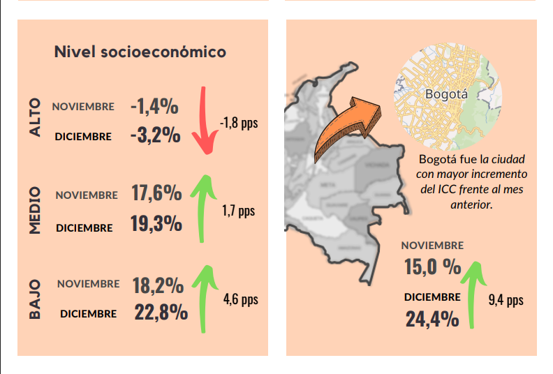 En diciembre, el Índice de Confianza del Consumidor (ICC) registró un balance de -22,3%, lo que representa un incremento de 2,5 puntos porcentuales (pps) frente al mes anterior, luego de tres meses consecutivos de resultados negativos. Esto demuestra una recuperación de la confianza de los consumidores, aunque el indicador se mantiene en niveles negativos. Este resultado obedeció principalmente a un incremento de 3,3 pps en el Índice de Expectativas del Consumidor y de 1,2 pps en el Índice de Condiciones Económicas. La confianza de los consumidores aumentó en los niveles socioeconómicos alto y bajo, mientras que en el nivel medio cayó en 0,4 pps. Con respecto a las ciudades analizadas, la confianza incrementó en todas las ciudades, excepto en Bogotá. La disposición a comprar vivienda disminuyó frente al mes de noviembre, mientras que la disposición a comprar bienes muebles y electrodomésticos incrementó.