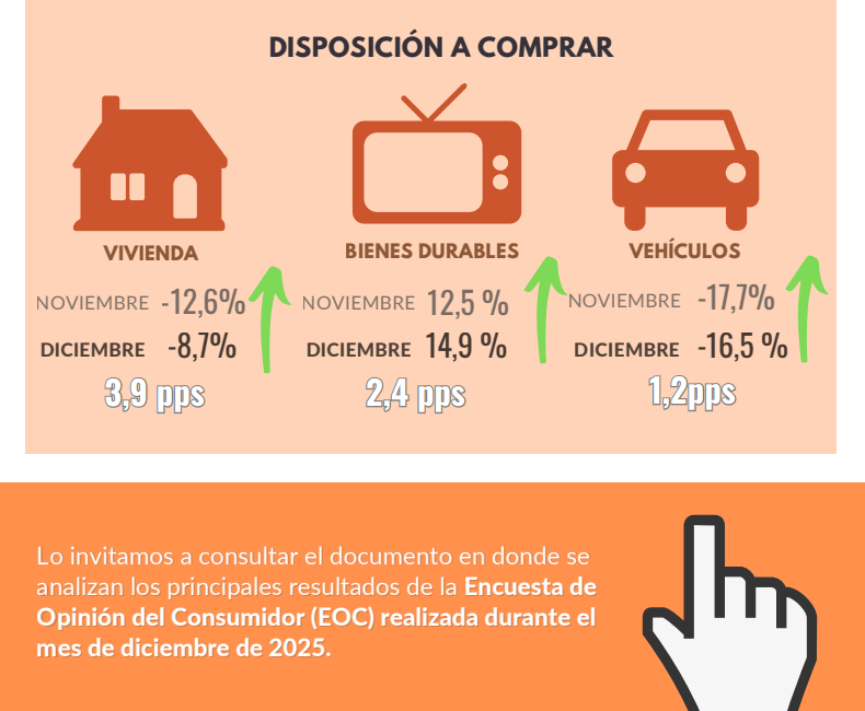 En el mes de diciembre, la confianza del consumidor aumentó en una de las cinco ciudades analizadas y en dos de los tres niveles socioeconómicos, respecto a noviembre de 2025. Adicionalmente, la disposición a comprar bienes durables aumentó al igual que la disposición a comprar vehículo y vivienda, frente a noviembre de 2025.