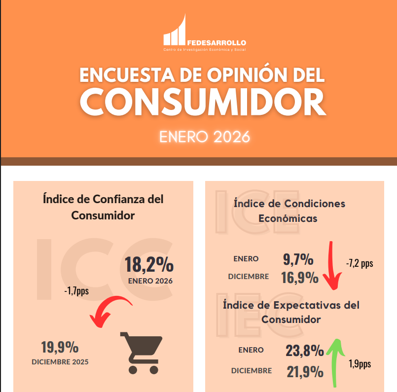 En enero de 2026, el Índice de Confianza del Consumidor (ICC) alcanzó un balance de 18,2%, disminuyendo en 1,7 puntos porcentuales frente al mes de diciembre de 2025 (19,9%). Este resultado obedeció a una caída de 7,2 puntos porcentuales en el Índice de Condiciones Económicas y a un aumento de 1,9 puntos porcentuales en el Índice de Expectativas del Consumidor. Frente a enero de 2025 (-1,1%), el ICC aumentó en 19,3 puntos porcentuales.