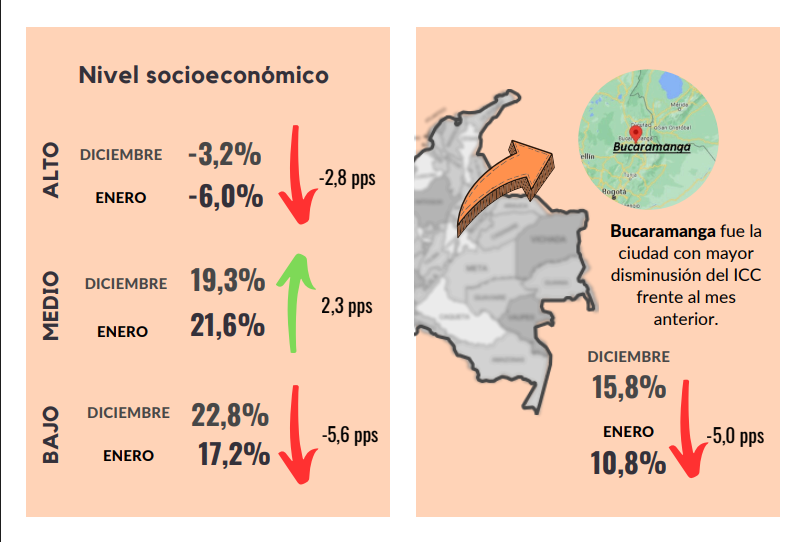 En el mes de enero, la confianza del consumidor incrementó en dos de las cinco ciudades analizadas y en dos de los niveles socioeconómicos, respecto a diciembre de 2024. Adicionalmente, la disposición a comprar vivienda incrementó, mientras que la disposición a comprar vehículo y bienes durables disminuyó, frente a diciembre de 2024.