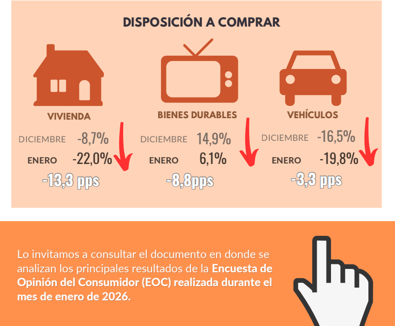 En el mes de enero, la confianza del consumidor aumentó en dos de las cinco ciudades analizadas y en uno de los tres niveles socioeconómicos, respecto a diciembre de 2025. Adicionalmente, la disposición a comprar vivienda disminuyó al igual que la disposición a comprar bienes durables y vehículo, frente a diciembre de 2025.